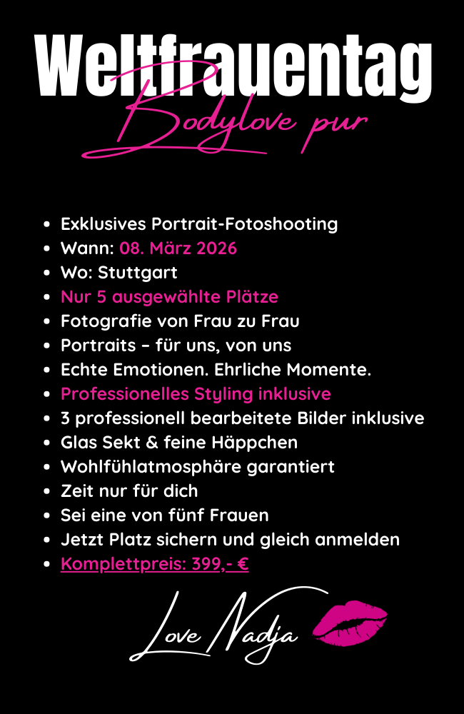 Und genau da möchte ich dich abholen. Du bist so viel mehr Wert, als nur eine Rolle. Darf ich dir zeigen, wie begehrenswert und wunderbar du bist? Willst du dich mit neuen Augen (wieder) sehen und spüren? Ich werde dich auf eine kleine Reise mitnehmen. Bei mir bekommst du mehr, also nur Bilder. Du bekommst einen Moment nur für dich. Fotografie von Frau zu Frau. Fotografie die berührt. Ob sinnlich, stark oder ganz zart.